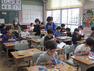 1組は理科で、「あかりとじしゃく」を使ったおもちゃを作っていました。